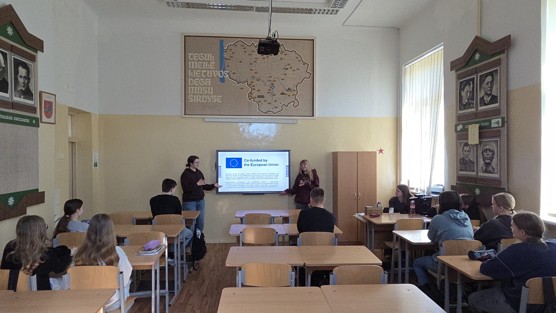 Rusnė and Saulė gave a presentation to 14 students at Marijampolės Rygiškių Jonas Gymnasium. Through a photo slideshow, they shared their experience in the E-Merge activity, talked about the sessions, the games, and what they learned. They also introduced E29 network, explained how to apply for future exchanges, and encouraged their classmates to give it a try.
