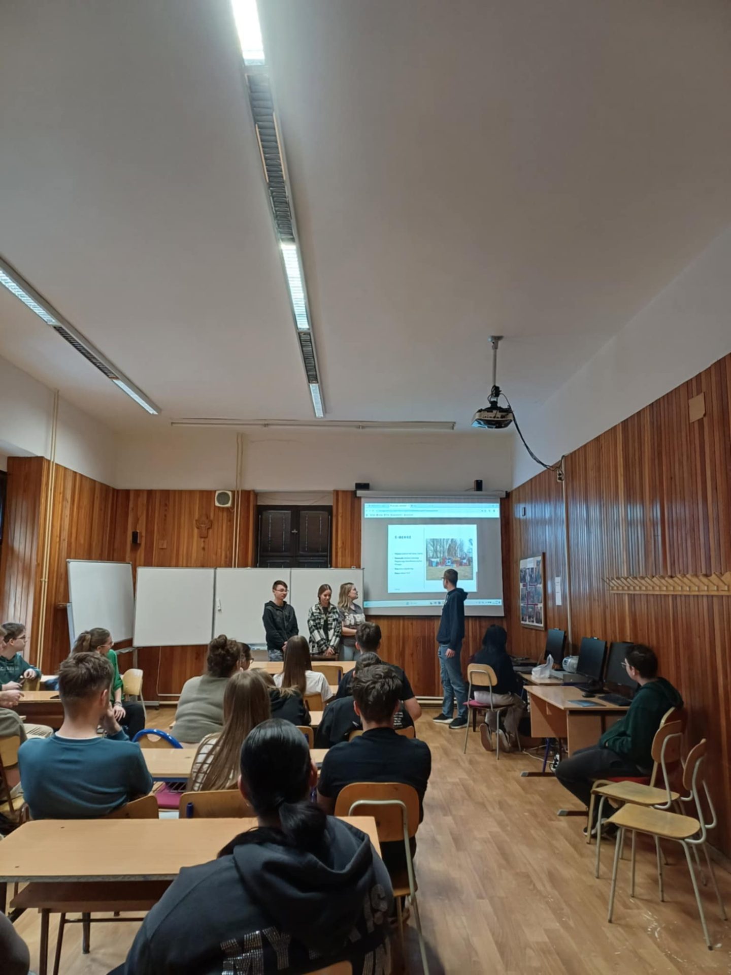 Kevin and Botond gave a presentation to 64 classmates at Tolna Vármegyei SZC Apáczai Csere János Technikum és Kollégium. They talked about their journey through the E-Merge activity—covering the travel, activities, topics, accommodation, and free time. They also introduced E29 network and highlighted the many benefits of participating in youth exchanges.