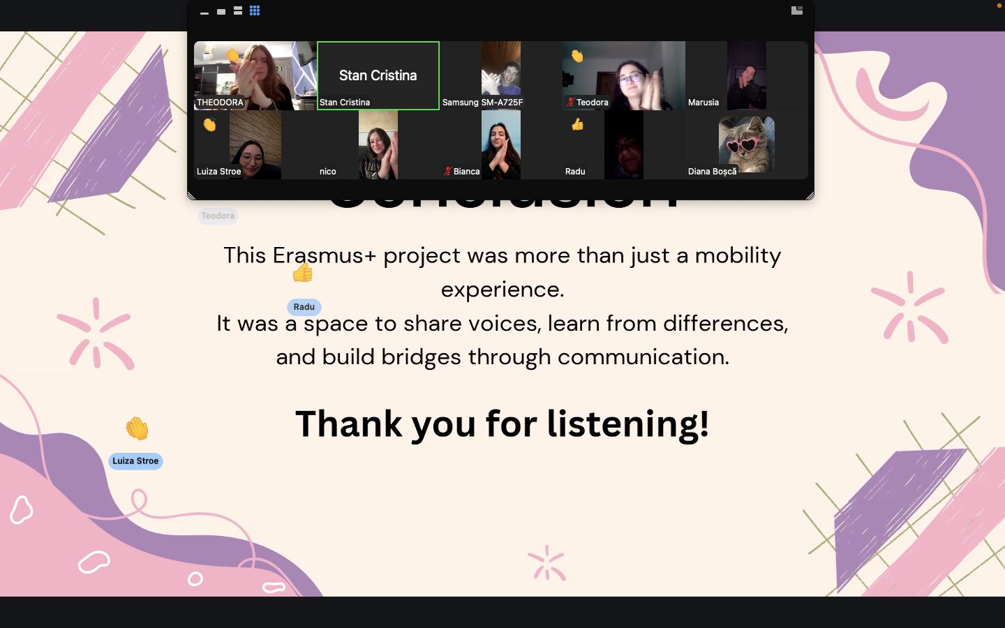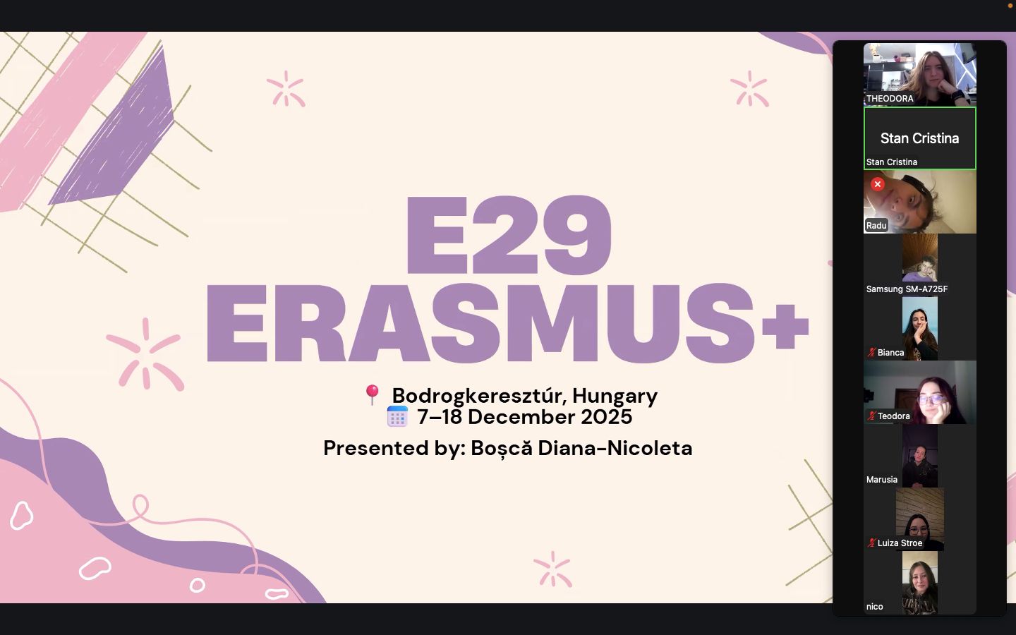 The dissemination activity consisted of an online Zoom presentation where Diana shared her Erasmus+ Youth Exchange experience on Inclusion and Diversity. She presented the Erasmus+ programme, the project’s objectives and activities, and shared learning outcomes with her friends, aiming to inform and inspire them to participate in future Erasmus+ opportunities.