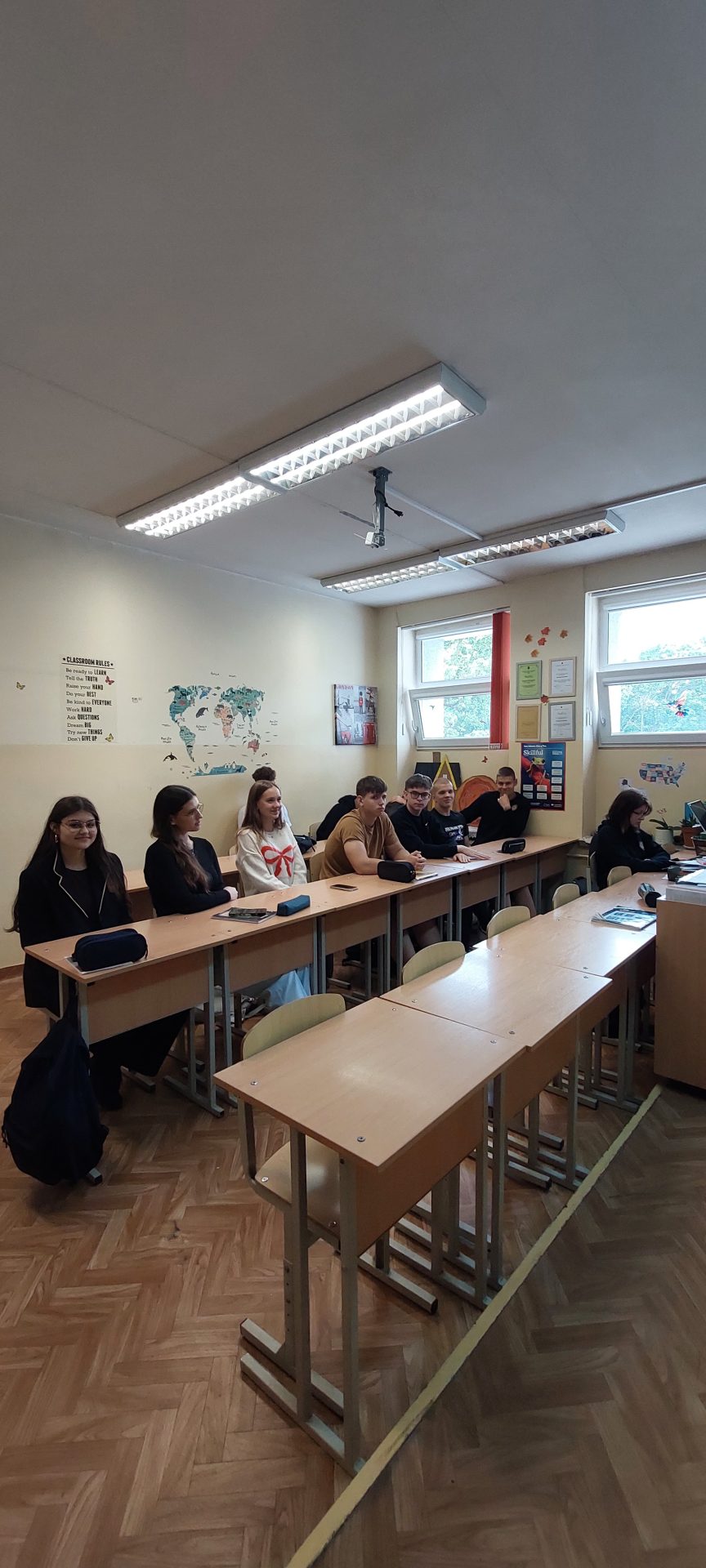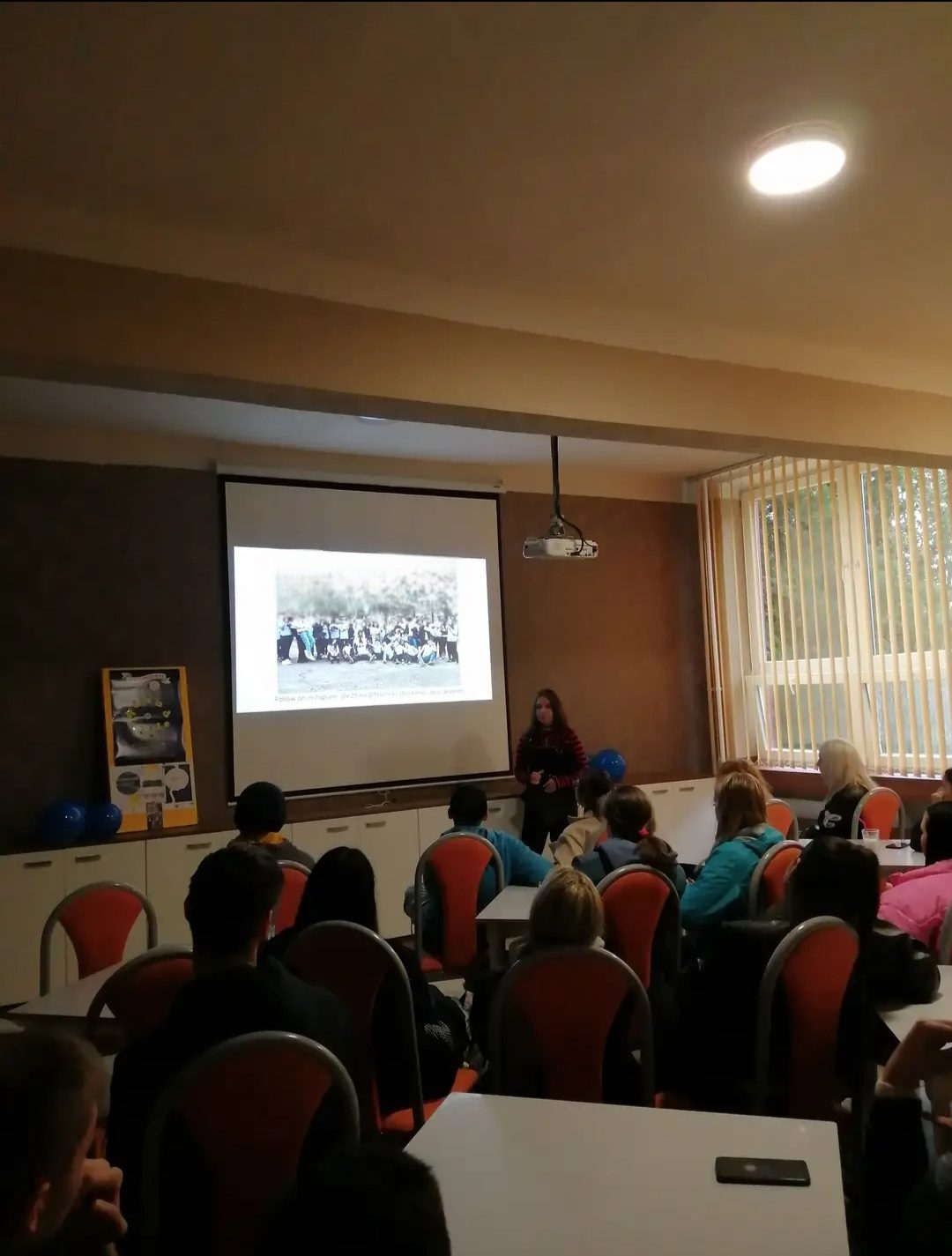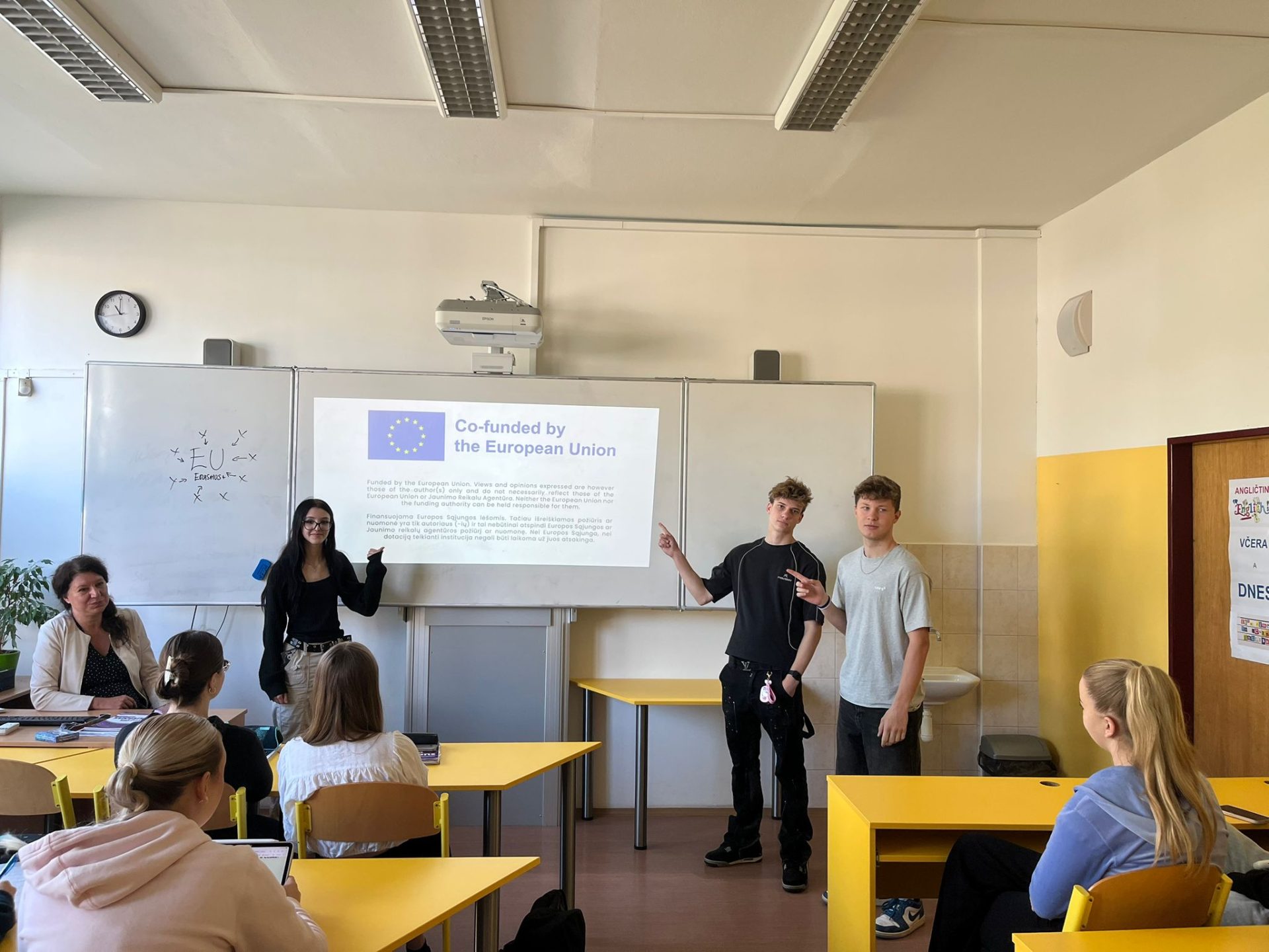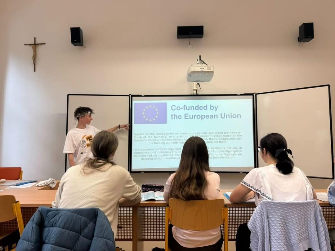 Rusne presented to 12 classmates at Marijampolės Rygiškių Jono Gimnazija, sharing slides about her trip to Hungary and her experience with E29, while explaining how others can apply and where to find more information.