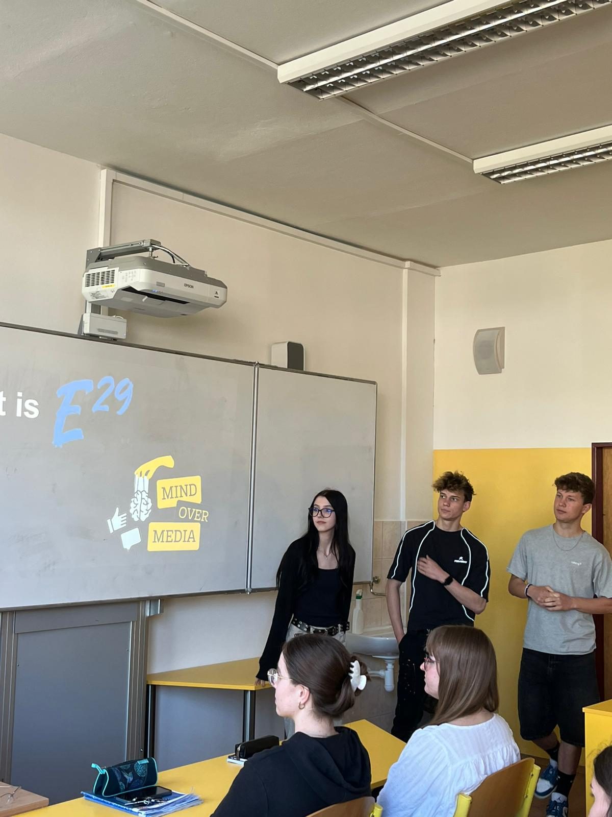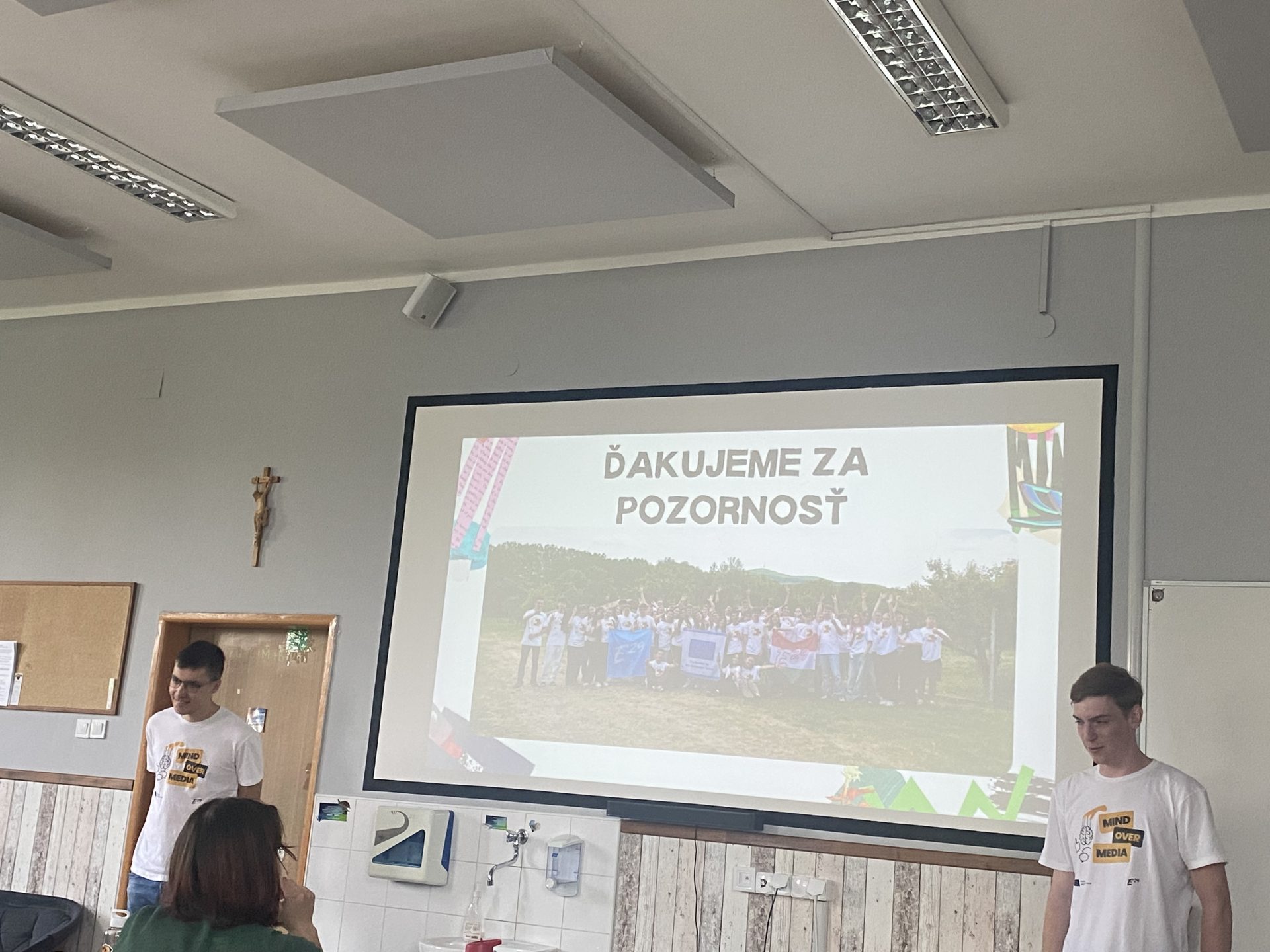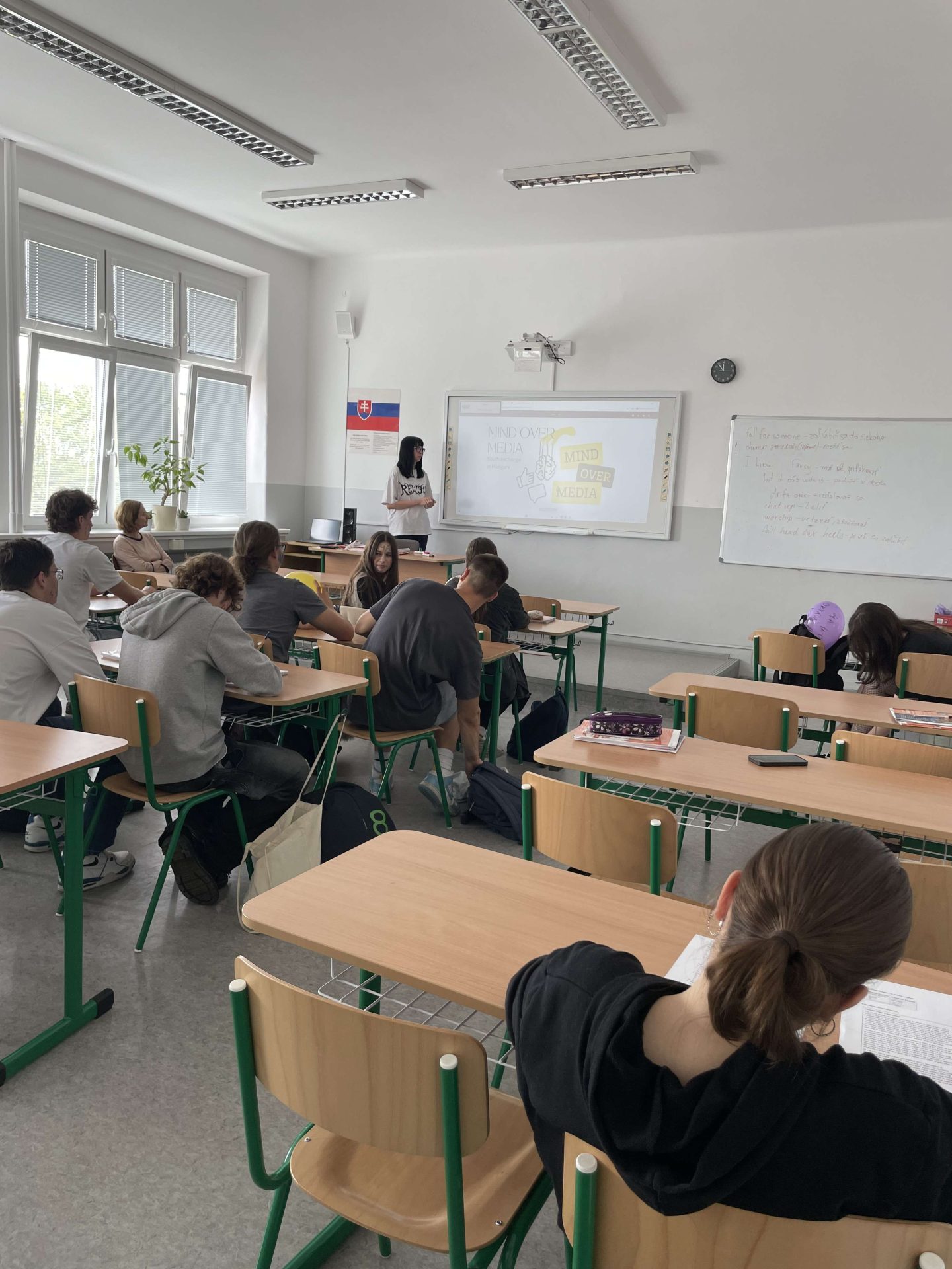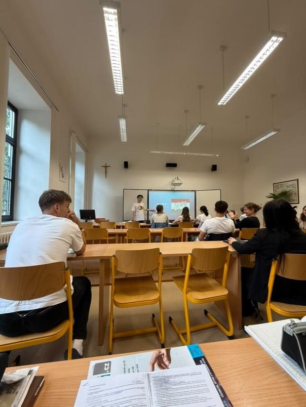 Maxmilian presented the Mind Over Media youth exchange at Arcibiskupské Gymnázium V Kroměříži to 16 classmates, sharing how E29 activities work, what a typical day looks like, and how learning differs from school.