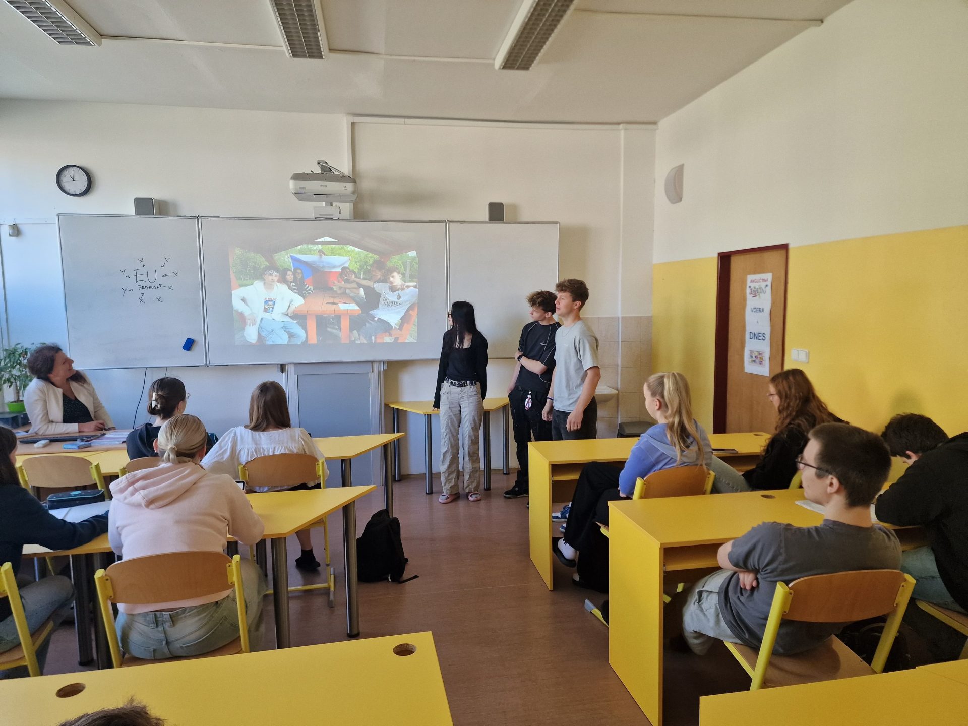 Julie, Prokop and Matyáš presented their E29 experience to 16 classmates at Sportovní Gymnázium, sharing photos, activity insights, and discussing Erasmus+, the EU, and cultural exchange.