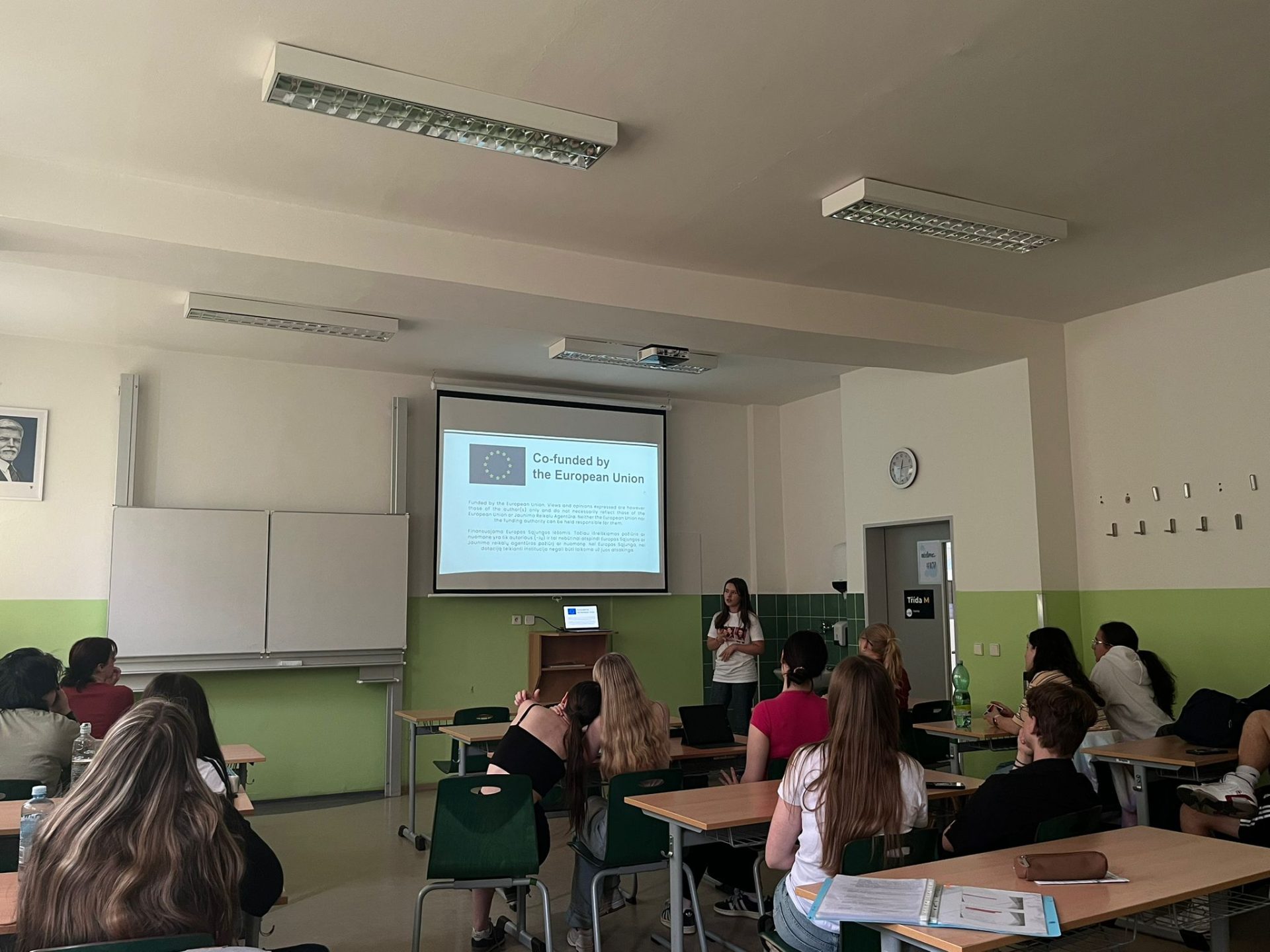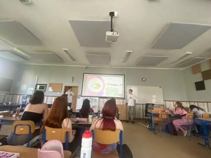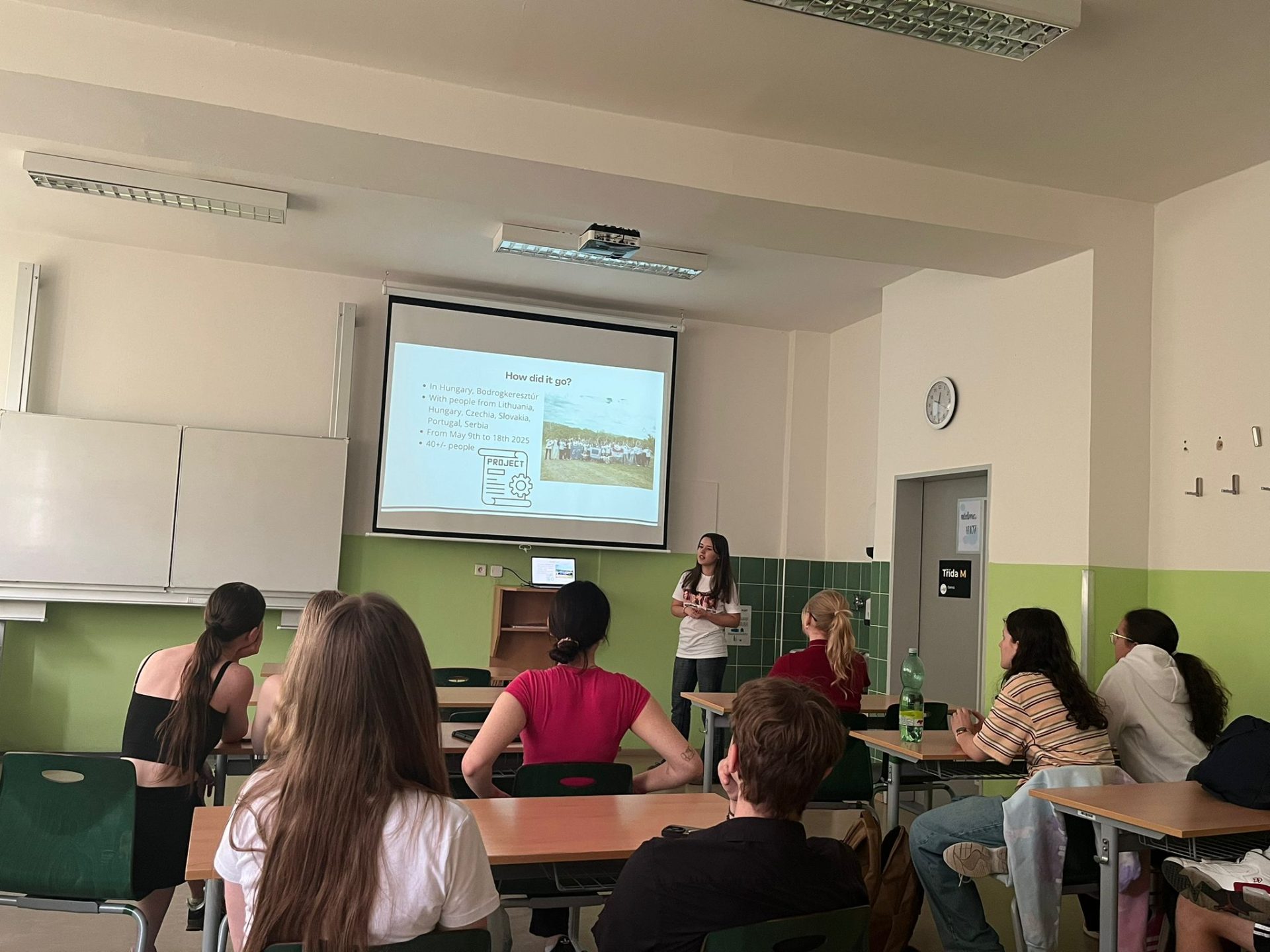 Karolina presented to 20 classmates at Střední Škola Gastronomická a Hotelová about the activity sessions, topics, and friendships made, motivating many to consider applying for similar activities.