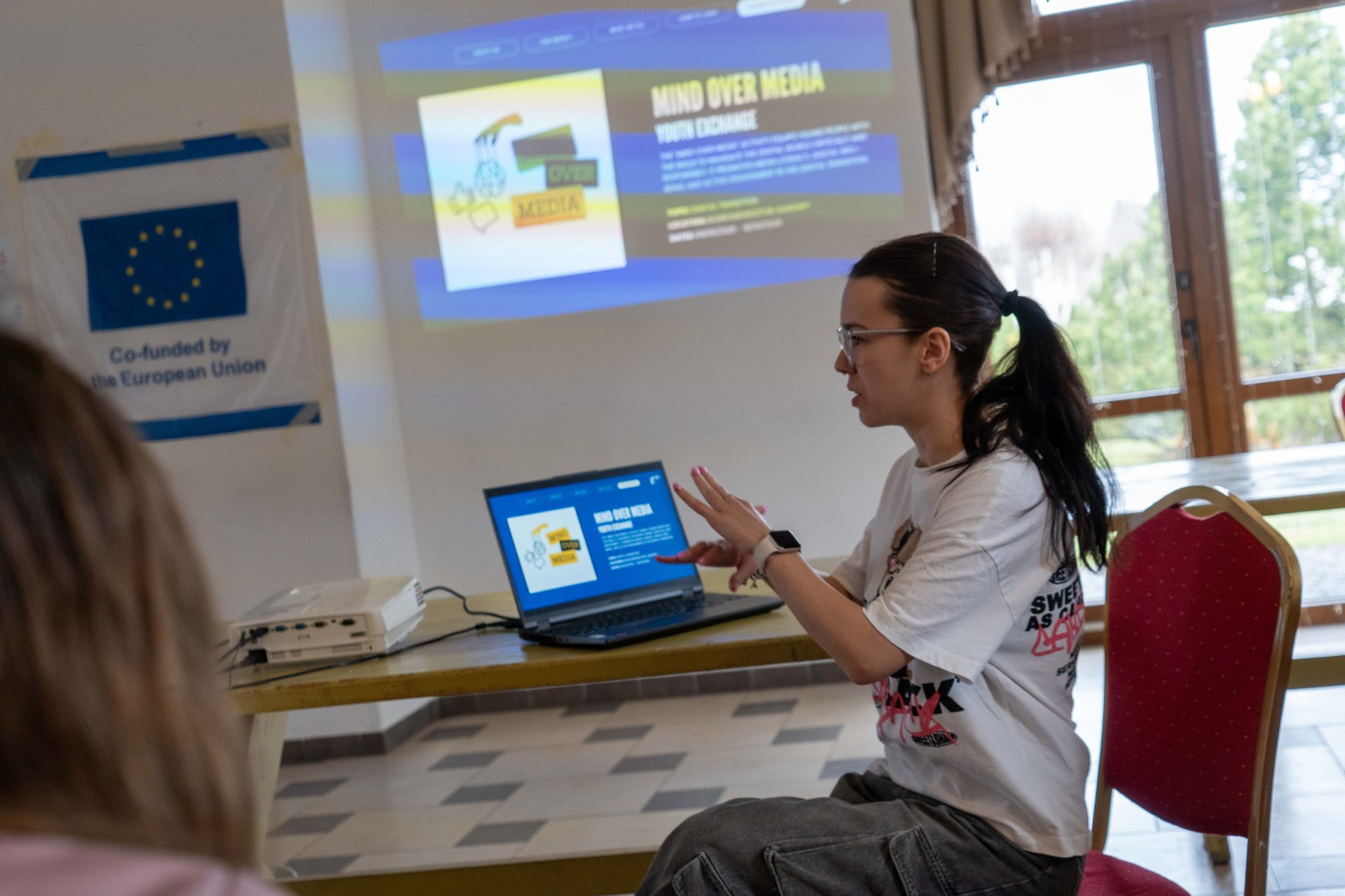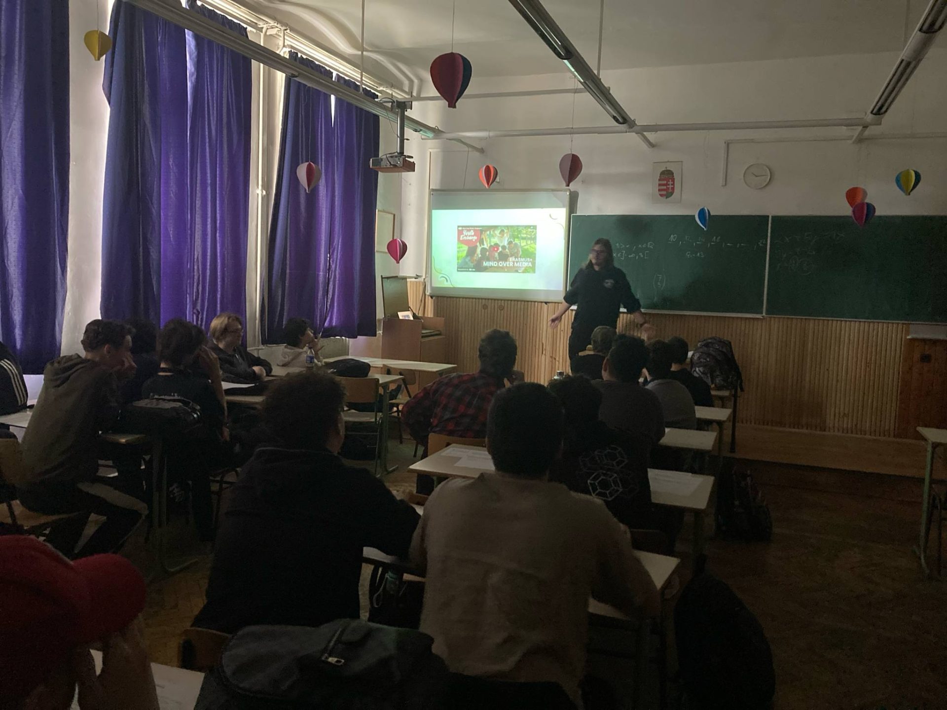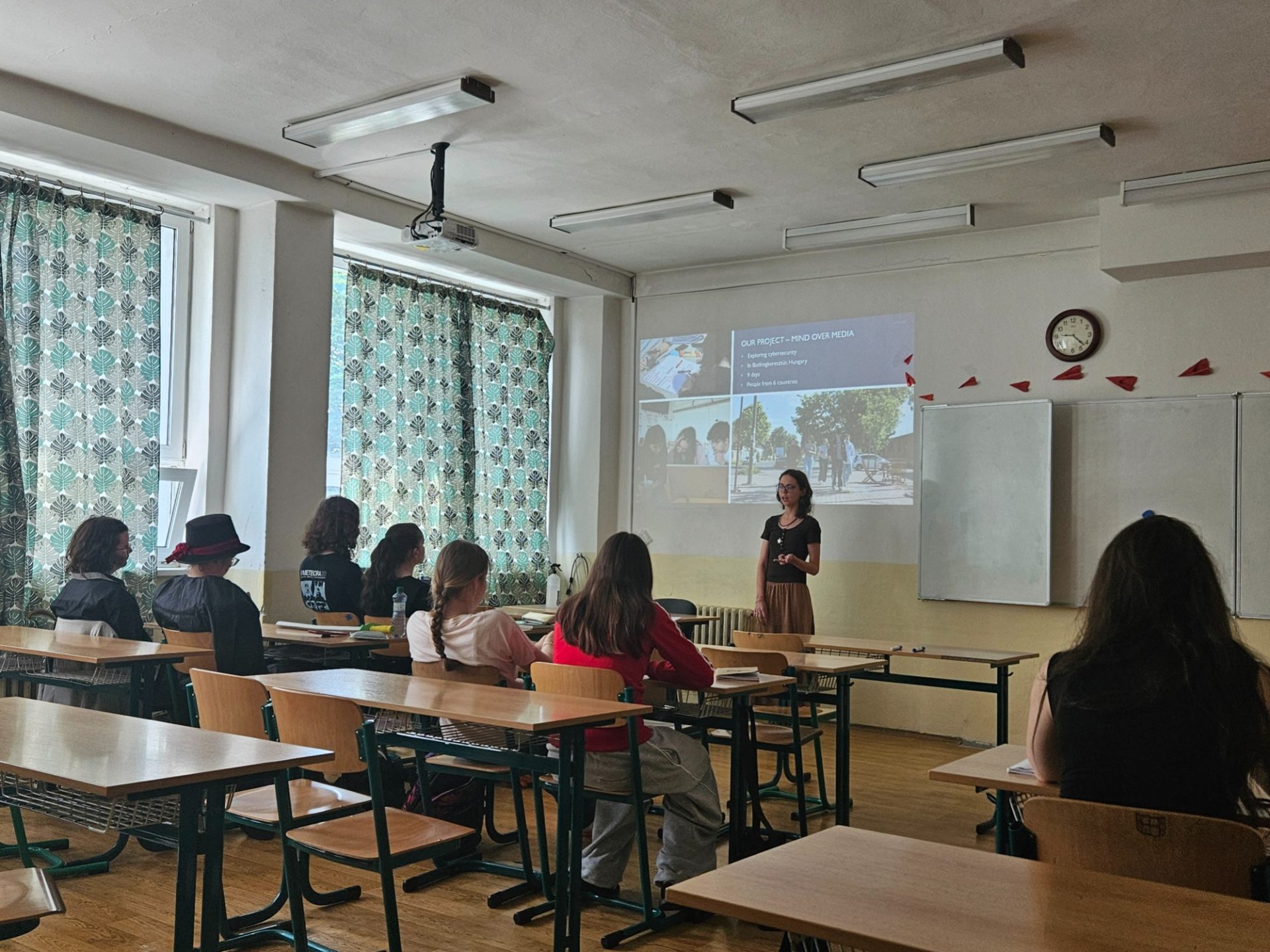 Sara presented to 25 classmates at Vajda Janos Secondary Grammar School about Erasmus+ youth exchanges, focusing on E29 and the Mind over Media activity, aiming to promote Erasmus+ opportunities.