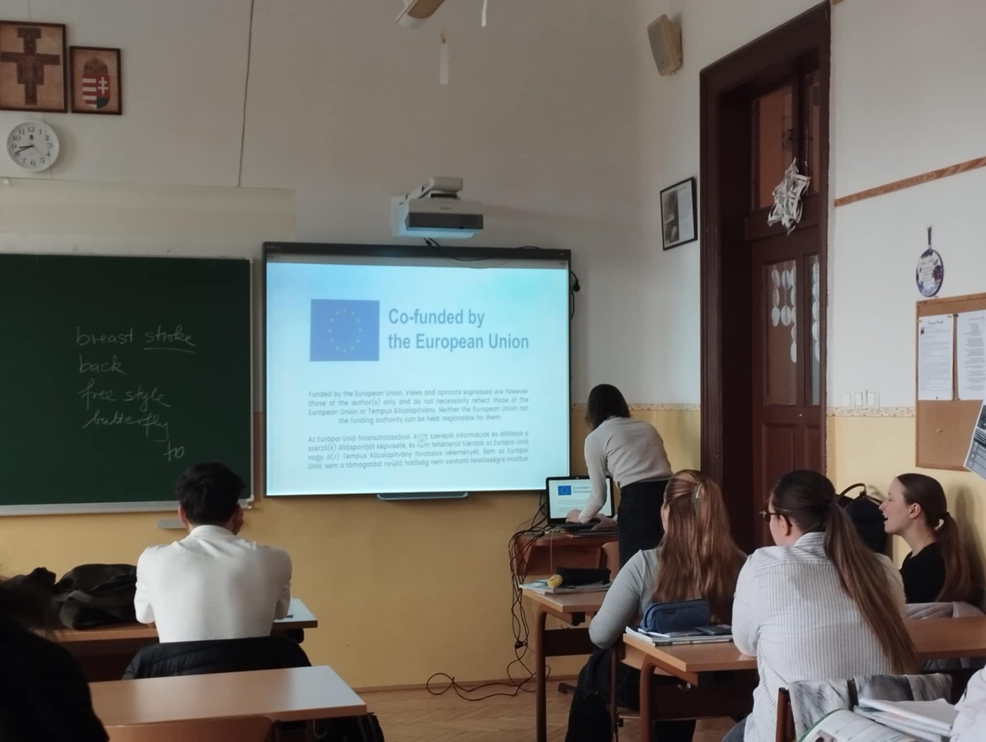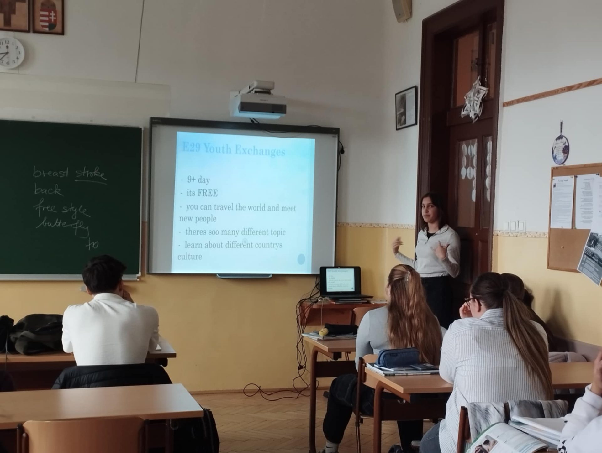 Sara presented to 15 classmates at Kanizsay Dorottya Katolikus Gimnázium, sharing about youth exchanges, the sport event, Mind Over Media, and her experience, while explaining how to apply for future activities.