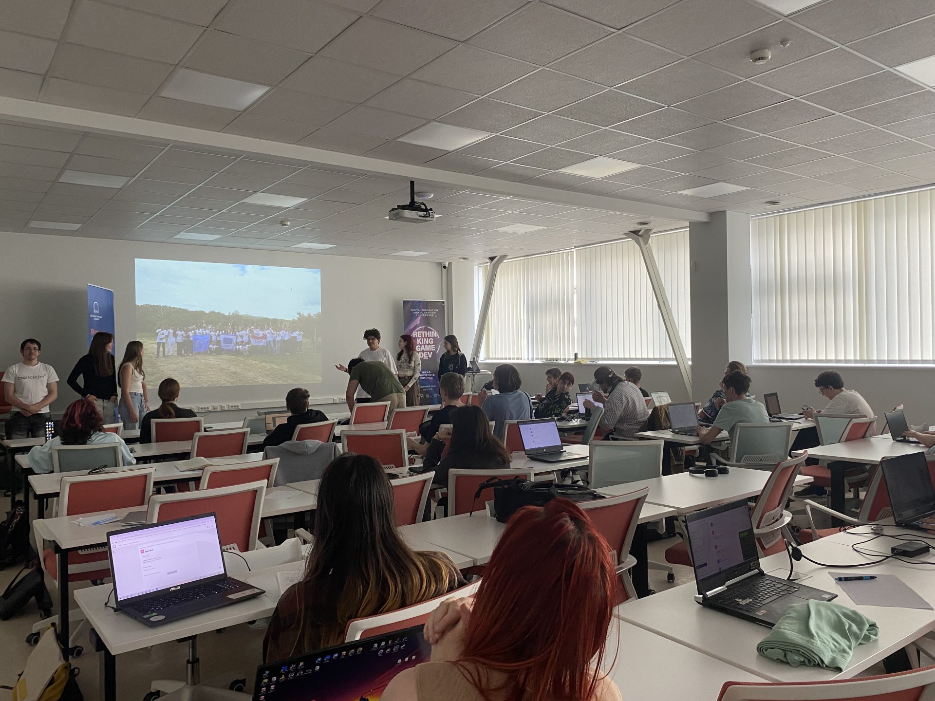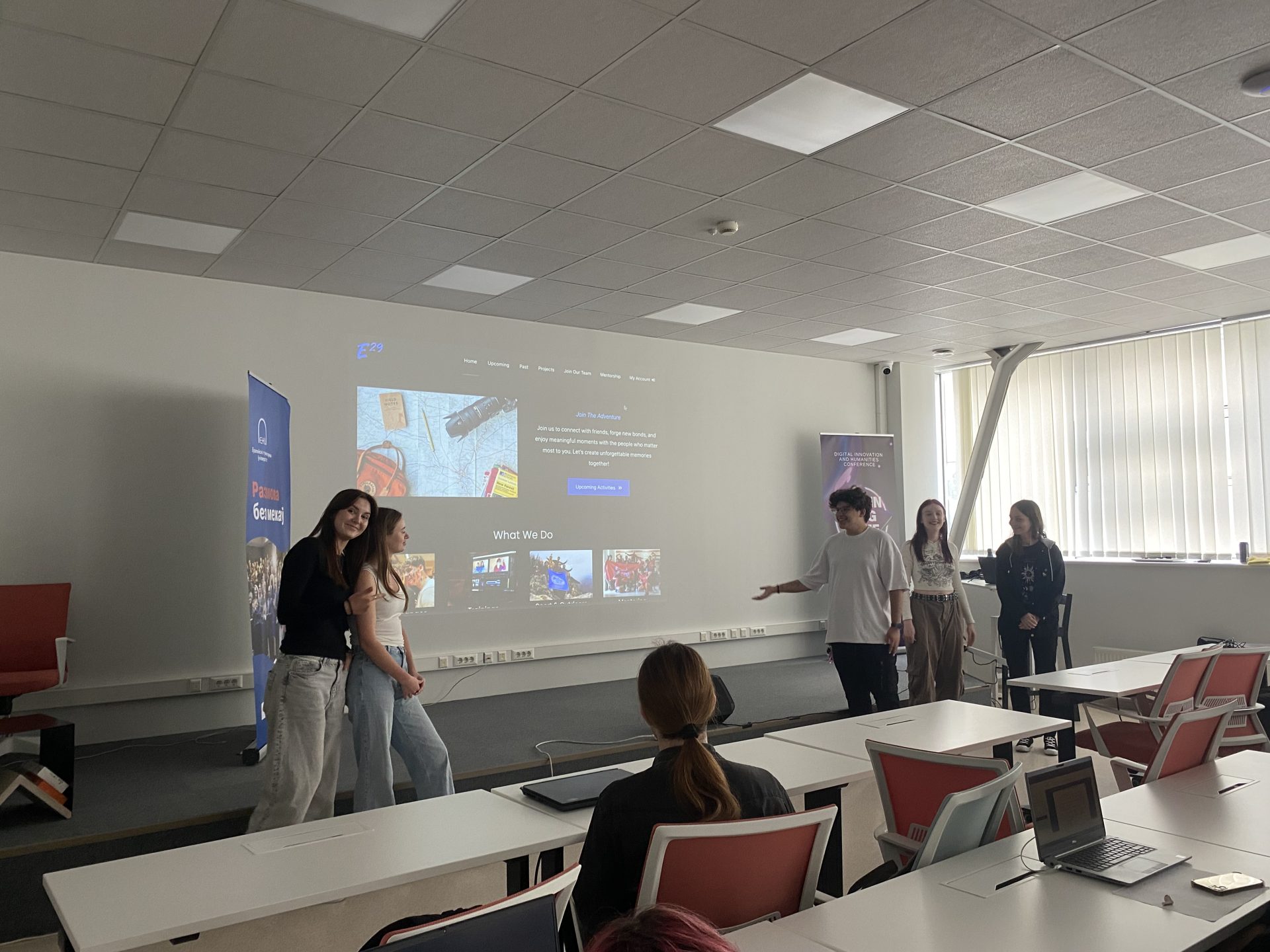 Dissemination by Maryia, Veranika, Igar, and other Lithuanian participants at the European Humanities University, reaching 25 peers with insights about Mind Over Media, the E29 website, and Erasmus+ opportunities.
