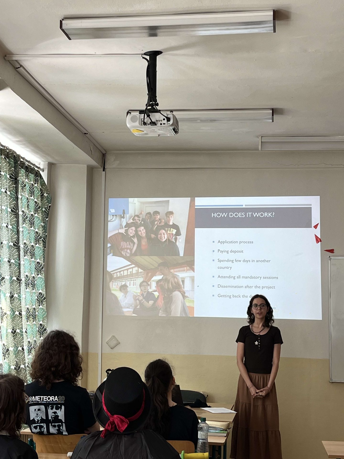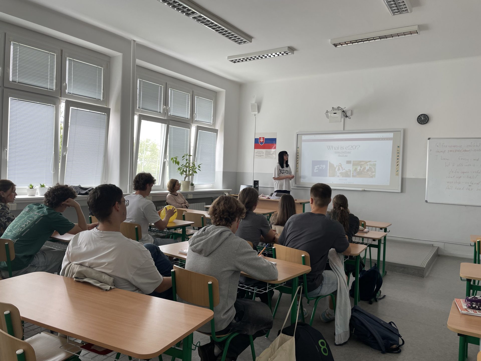 Romana presented to 15 classmates at Gymnázium Pezinok, explaining what E29 is, its benefits like travel and skill development, and encouraged them to consider participating in such activities.